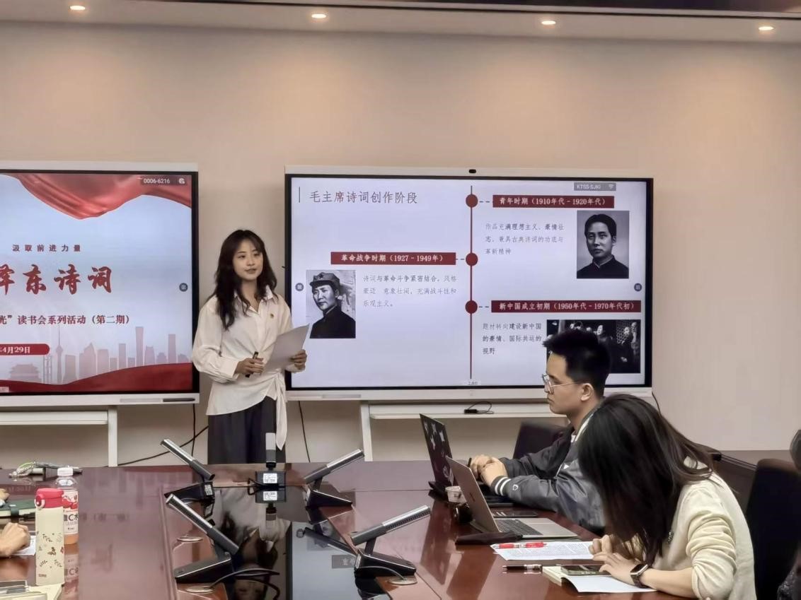 4月29日下午,威廉希尔中国官网员工第三党支部“逐光”读书会第二期在公司210会议室顺利举行。本次活动以“品读毛泽东经典诗词”为主题,由党支部书记张若玉老师主持,通过诗词鉴赏、经典诵读、交流分享等环节,带领支部全体成员回溯历史,深刻感悟伟人诗词中蕴含的磅礴精神力量。
