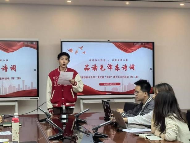 随后,支部的党员同志围绕自身阅读毛主席诗词的独特感受踊跃发言。严璇同志分享时谈到,毛泽东诗词的磅礴力量震撼人心,“问苍茫大地,谁主沉浮”唤起青年担当,“红军不怕远征难”传递无畏精神。李峥同志则谈到,毛泽东诗词以凝练笔触勾勒出长征、解放战争等革命图景,生动再现革命战争的艰辛壮烈,品读这些诗词,能够深刻认识到革命胜利的来之不易。