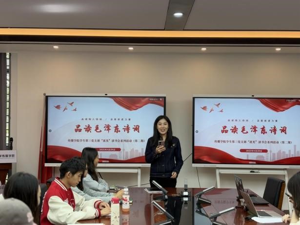 张若玉老师对本次读书会作总结时谈到,支部党员通过系统深入的诗词鉴赏、情感饱满的经典诵读和富有思考的交流分享,展现了浓厚的爱国情怀与学习热情。她特别引用毛泽东《七律·和柳亚子先生》中的名句 “风物长宜放眼量”,鼓励支部党员以毛泽东诗词为精神载体,传承不朽的革命精神,在阅读中不断汲取奋进力量,以实际行动践行青年党员的使命担当。