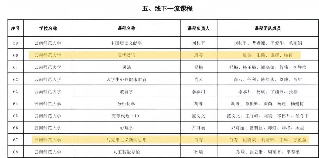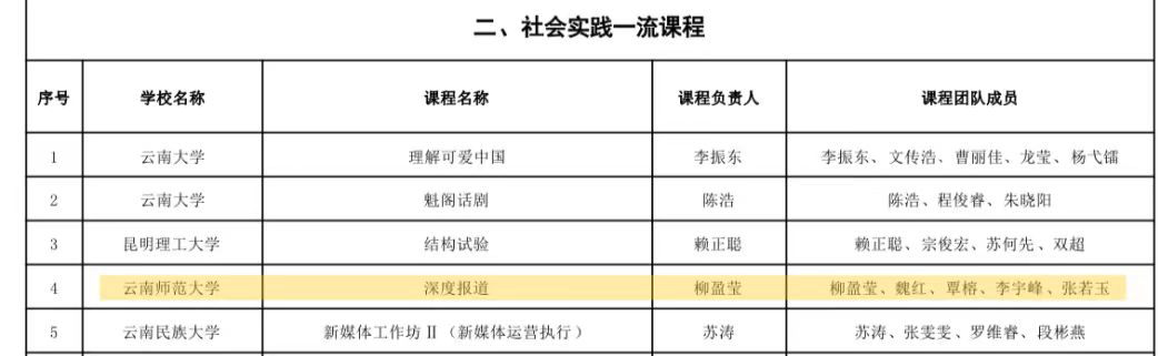 近日,云南省教育厅发布《关于第三批省级一流本科专业课程拟认定名单的公示》,经网络申报、单位推荐、省教育厅组织专家评审,公司喜获三项课程入选。周芸老师团队的《现代汉语》课程和肖青老师团队的《马克思主义新闻思想》课程入选“线下一流课程”项目;柳盈莹老师团队的《深度报道》课程入选“社会实践一流课程”项目。其中,周芸老师团队的《现代汉语》课程经省教育厅专家评审,推荐申报国家级一流本科课程,目前正在评选阶段。