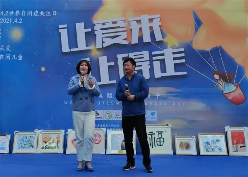 2021年世界孤独症日 王平宇(右)和蒙多贝创始人范贵云(左)