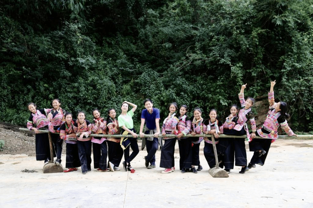 张萍、关於夫妇(中间)与“彩云女孩”们在毛竹做的把杆前