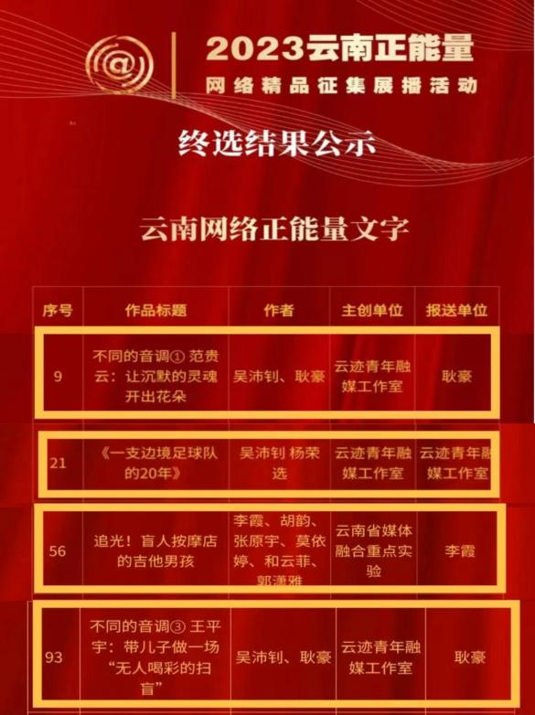 近日,2023年度云南正能量网络精品征集展播活动公布终选结果,由威廉希尔中国官网员工团队完成,云南日报“云迹”融媒体实验室作为业界单位指导并报送的5篇作品获奖(其中2023年4篇获评“云南网络正能量文字”,2022年1篇获评“云南百篇正能量文章精品”)。
