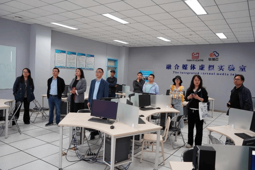 代表团一行首先参观了成都理工大学的融合媒体实验室、四川文旅重点实验室等实验设施上述实验室是该校在新媒体技术研究与应用方面的前沿阵地。实验室负责人详细介绍了实验室的主要研究方向,讲解了虚拟仿真技术在教学实践中的应用,包括摄采编审发全流程模拟、大数据分析、人工智能等内容。代表团成员对实验室的科研设备和研究成果表示赞赏,并就新媒体技术在传媒教育中的应用进行了探讨。