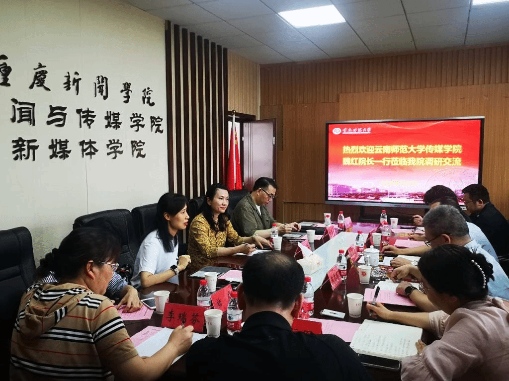 随后,双方进行座谈。重庆师范大学新闻与公司党委书记郑志坚、经理颜春龙、党委副书记赵艳君、副经理赖黎捷、副经理杨琪、广播电视硕士点负责人刘远军、新闻系主任李瑞芬、新闻系教工党支部书记方龙、影视系主任张楚、影视系副主任吴荣彬、实验室主任傅大志、教科班主任孙柳艳、办公室主任史婷婷等参加座谈会交流。