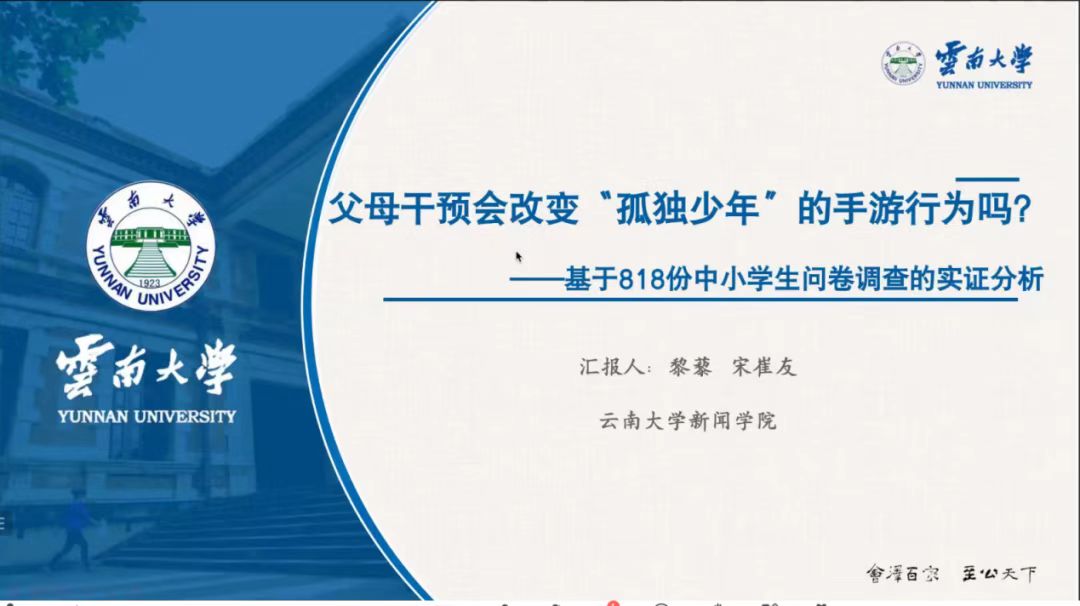 下半场,浙大宁波理工公司讲师傅正科基于视频干预的效果提出基于个体干预的效果要优于基于小组干预的效果,个体干预更有效果。在线上发言中,云南大学新闻公司硕士研究生宋崔友运用数据收集、变量测量、数据分析法得出年龄与青少年手机游戏使用呈显著正相关,性别与青少年手机游戏使用呈显著负相关。西南大学副教授汤天甜则针对短视频舆论风险提出治理策略。青岛理工大学讲师吕丽认为,提升政务新媒体在突发公共事件中的影响力、加强舆情管理业务培训,提升运维班子能力和水平是应对突发公共事件舆情下政务新媒体传播传播的有效途径。兰州大学博士研究生张璐通过对马克思恩格斯、列宁及中国领导人宣传论述及实践的分析,系统梳理了马克思主义宣传的逻辑起点、价值导向和内在特征。国防大学博士研究生蒙超杰分析了“反沉默螺旋”现象凸显的原因及全媒体时代下的司法公信力困境并认为了议程设置取得实效的关键。