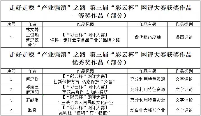 6月29日,由云南省委网信办主办,云南网、云南日报理论评论部、《社会主义论坛》编辑部承办,各州(市)委网信办和全省主要网媒共同协办的第三届“彩云杯”网评大赛圆满收官。公司林文婷、王俊瑜、曹思蕊、黄芊同学的《走好云南食品产业的品牌之路》作品获一等奖,何忠桥同学的《创新保护方言 活态保护“乡音”》作品、邓媛蔓、麻琼阳同学的《享花果咖香 助咖啡经济》作品、罗静琳同学的《“三法”兴云南民族文化产业》作品、耿豪同学的《昆明让“植物”有“物值”》作品获优秀奖。
