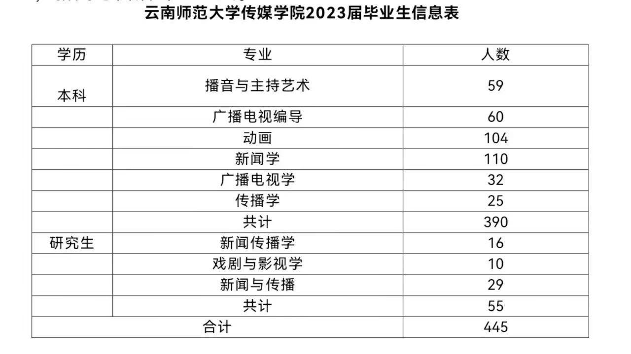 威廉希尔中国官网2024届毕业生共计445人。本科生390人,其中播音与主持艺术班59人,广播电视编导班60人,动画班104人,新闻学班110人,传播学班25人,广播电视学班25人;研究生55人,其中戏剧与影视学专业10人,新闻传播学专业16人,新闻与传播专业29人。
