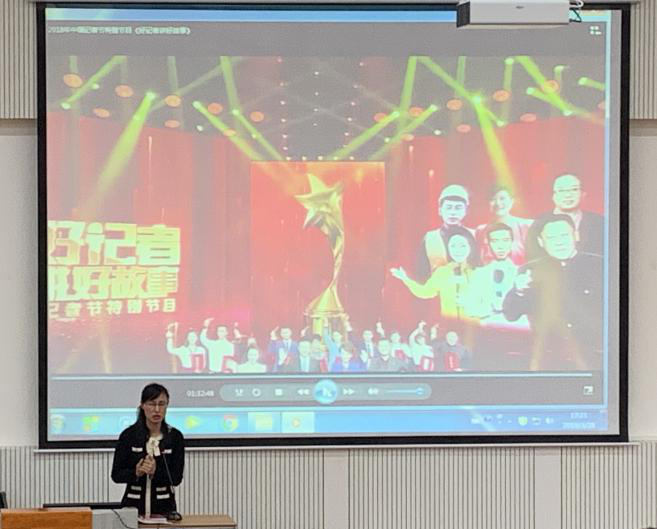 报告会上,肖青教授带领大家共同观看了“好记者讲好故事2018年中国记者节特别节目”,节目里有十位记者讲述了十个不同的故事。