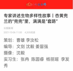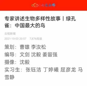 据悉,本次《专家讲述生物多样性故事》共9期,分别采用视频和科普文章推送两种形式在云南电视台晚间新闻、七彩云端客户端推送。七彩云端文章侧重挖掘生物科普中的趣味点,同学们以诙谐幽默的视角配合专业媒体记者一线访谈进行采写创作,增强了科普文章的可读性和趣味性。此外,根据前期策划,节目在专业一线记者访谈的同时,别开生面的增加了从年轻老员工的视角拍摄访谈花絮和讲述“轻科普”知识,鼓励同学们通过vlog等短视频形式进行传播,促进节目多渠道、多平台融合传播,提升传播力。