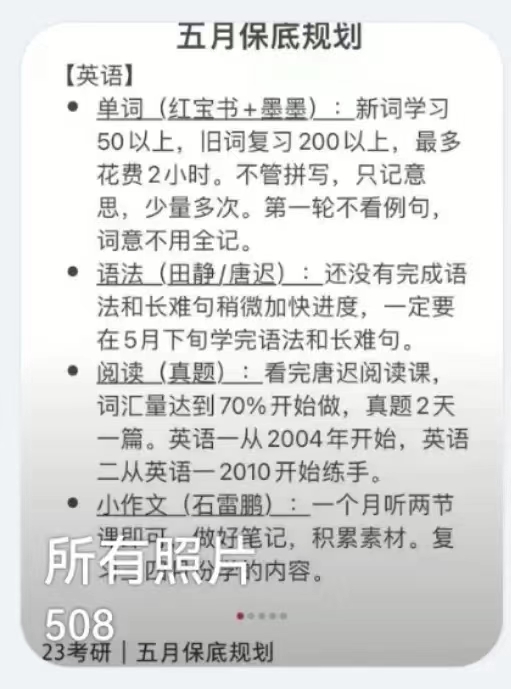 这张照片是小红书上一个考研五月保底复习计划的截图,因为想参考别人的复习进度,督促自己。