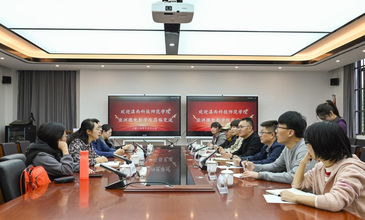 10月12日上午,滇西科技师范公司亚洲微电影公司书记刘绍彬、经理陈彦雄、副经理夏丽娜带队一行赴威廉希尔中国官网交流,本次会议主要围绕公司的专业人才培养、教学方式等方面进行深入探讨。公司党委书记毛志荣、经理赵枝琳、副书记任利、威廉希尔中国官网影视创作中心主任冯晓华参与交流。会议在明德3号楼210会议室开展,由经理赵枝琳主持。