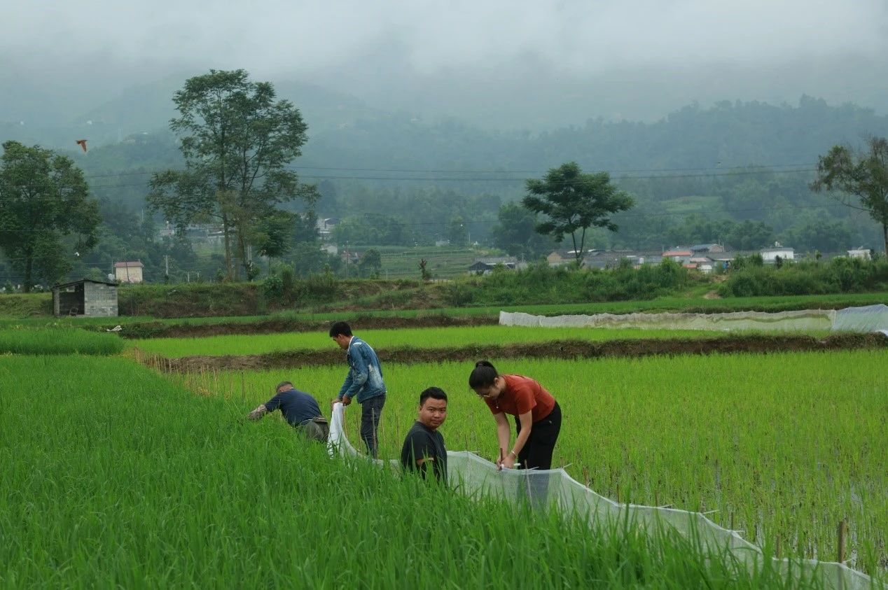农民们在为稻花鱼围网