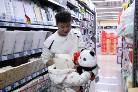 来自乌鲁木齐的杨军今年与妻子一同回宾川过年,他带着孩子在玩偶区挑选玩具。今年第一次和老婆回这边过年,感觉新年气氛很浓厚,比我们那热闹很多。杨军一边拿着熊猫玩偶哄小孩,一边说道,年货这些老婆和岳母都买好了,今天主要就是来逛逛,带小孩来买她的年货新年不仅是送旧年,迎新春,更是阖家团圆的大好时光,杨军在宾川的第一个年,他觉得很开心,很幸福。