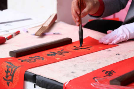 街头,一张木桌上铺满红纸,民间艺人挥笔两下,便写出了一对漂亮的对联,书法艺术里也掺杂了新春的喜乐氛围。